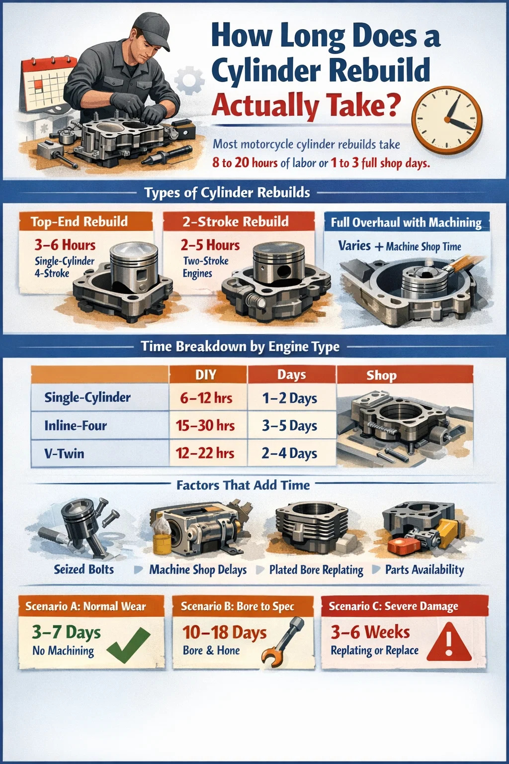 Voor de meesten motorfiets cilinder verbouwingen, waar u rekening mee moet houden 8 tot 20 uur arbeid als u het werk zelf doet, of grofweg 1 tot 3 volledige winkeldagen als de klus wordt overgedragen aan een professionele monteur. Dat bereik is met opzet groot: de werkelijke tijd hangt sterk af van het motortype, de staat van de cilinder, of er werk in de machinewerkplaats nodig is en de beschikbaarheid van onderdelen.