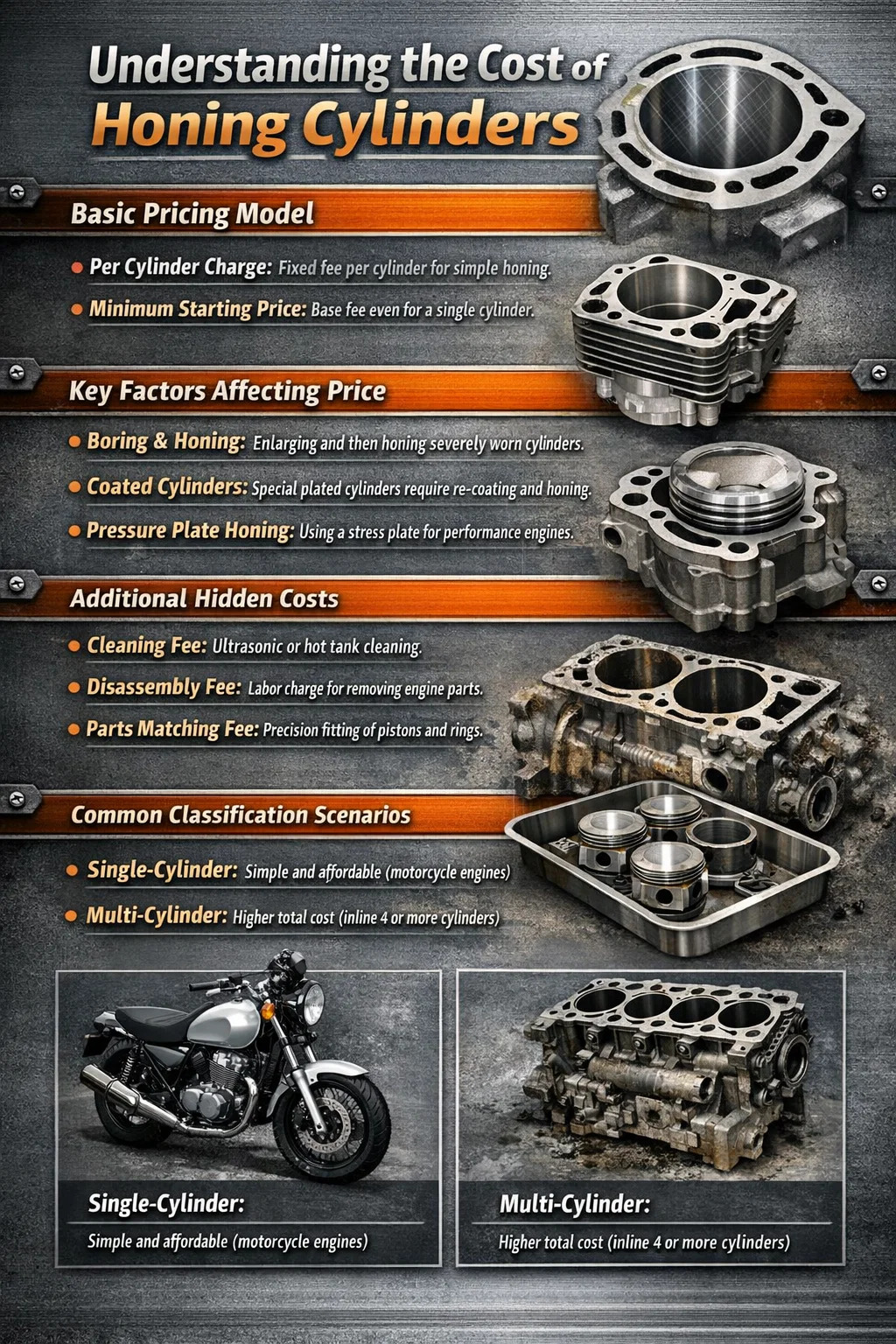 Geladen per cilinder: Dit is het meest voorkomende model. Normaal gesproken rekent de winkel een vast bedrag per cilinder. Als u alleen eenvoudige "cross-arcering" nodig heeft (het herstellen van het oppervlaktepatroon om de afdichting van de zuigerveren te bevorderen), zijn de kosten per cilinder relatief laag.