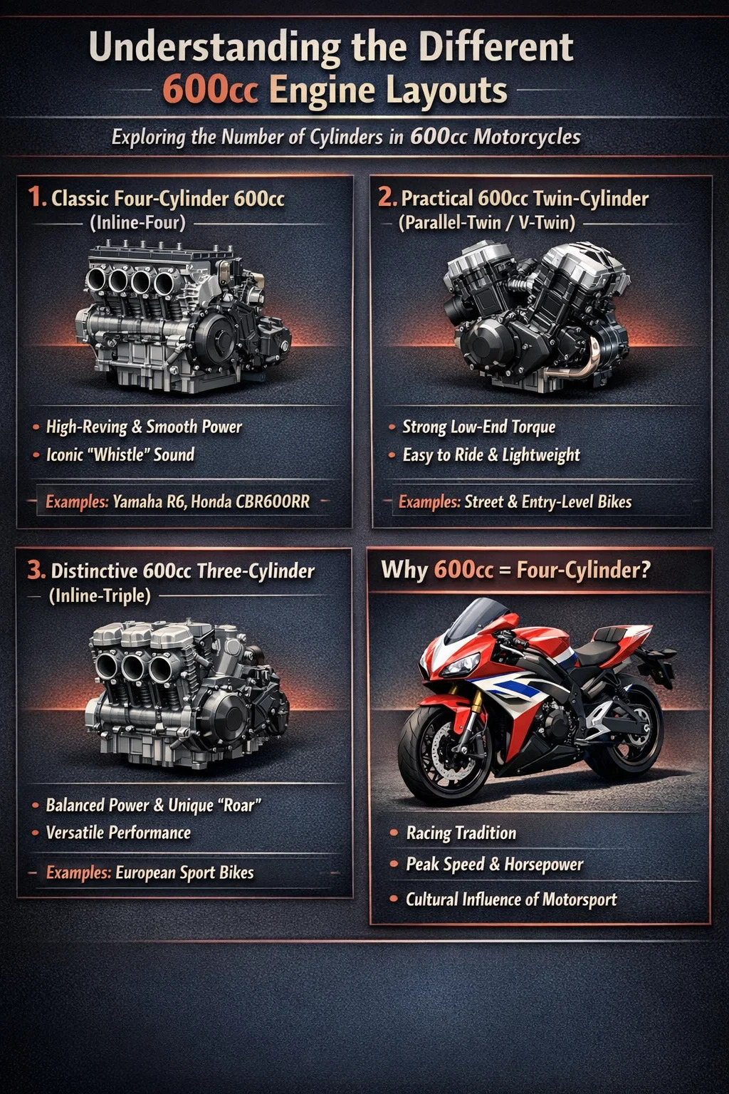 Hier is een gedetailleerde introductie over het aantal cilinders en de kenmerken van 600cc-motoren: