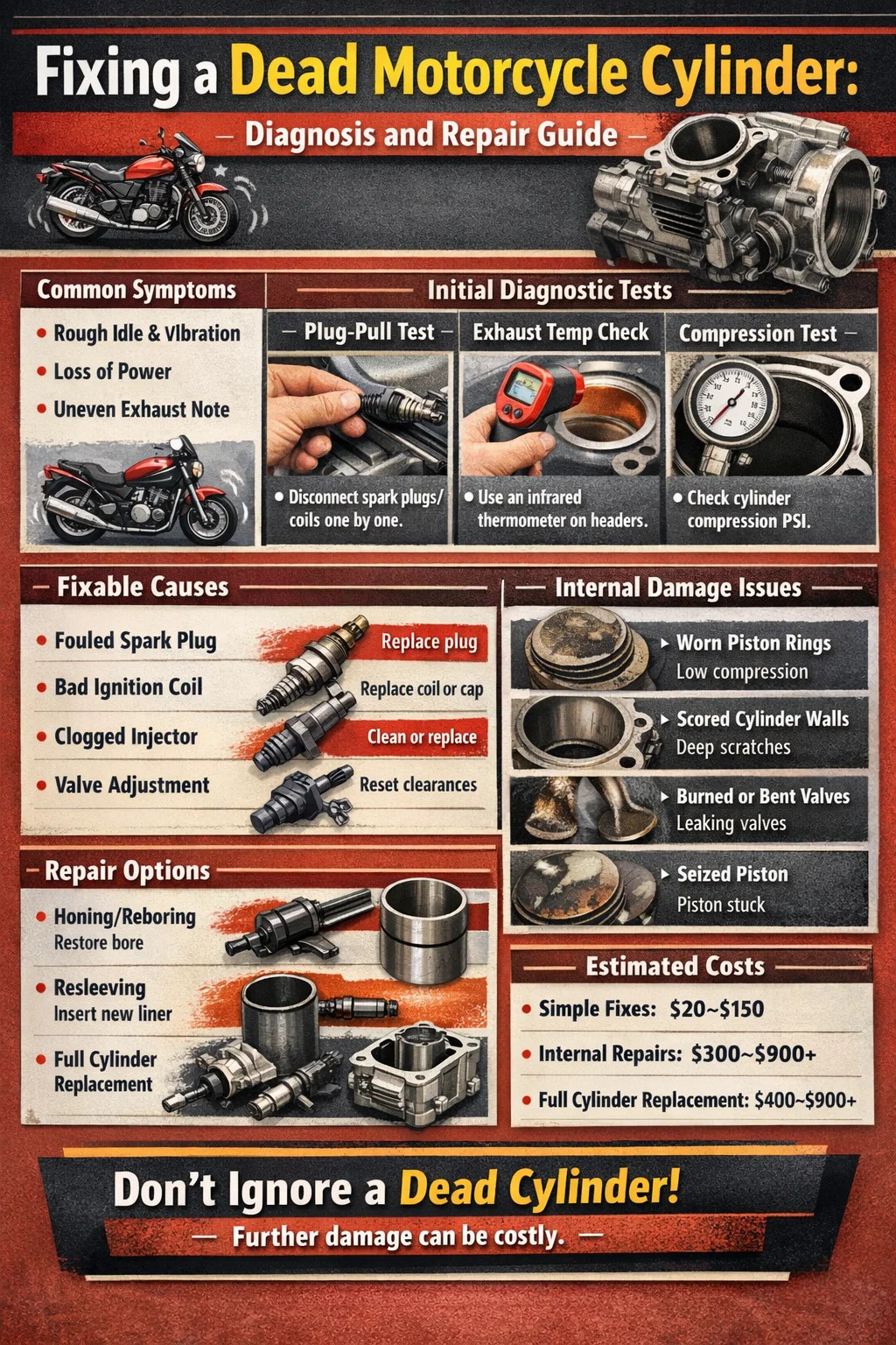 Een motorfietscilinder die kapot is gegaan als gevolg van een vervuilde bougie, een verstopte brandstofinjector, een defecte bobine of een klein probleem met de klepafstelling, kan met relatief eenvoudige en goedkope reparaties weer tot leven worden gewekt. Aan de andere kant van het spectrum zal een cilinder met een gegroefde boring, een gebarsten loop, een vastgelopen zuiger of ernstige ringslijtage meer mechanisch werk vergen, inclusief mogelijke cilindervervanging of herboren. Het punt is dat "dode cilinder" geen enkele diagnose is. Het is een symptoom dat terug te voeren is op veel verschillende hoofdoorzaken, die elk hun eigen reparatietraject en kosten met zich meebrengen.