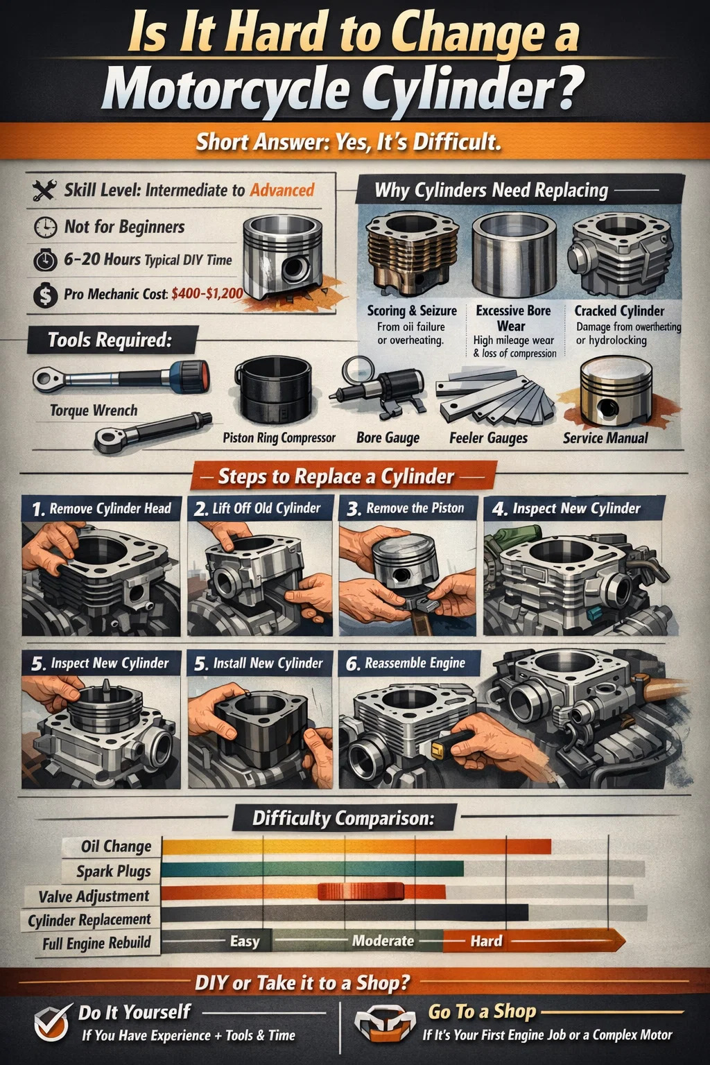 Is het moeilijk om een motorfietscilinder te vervangen? Eerst het korte antwoord