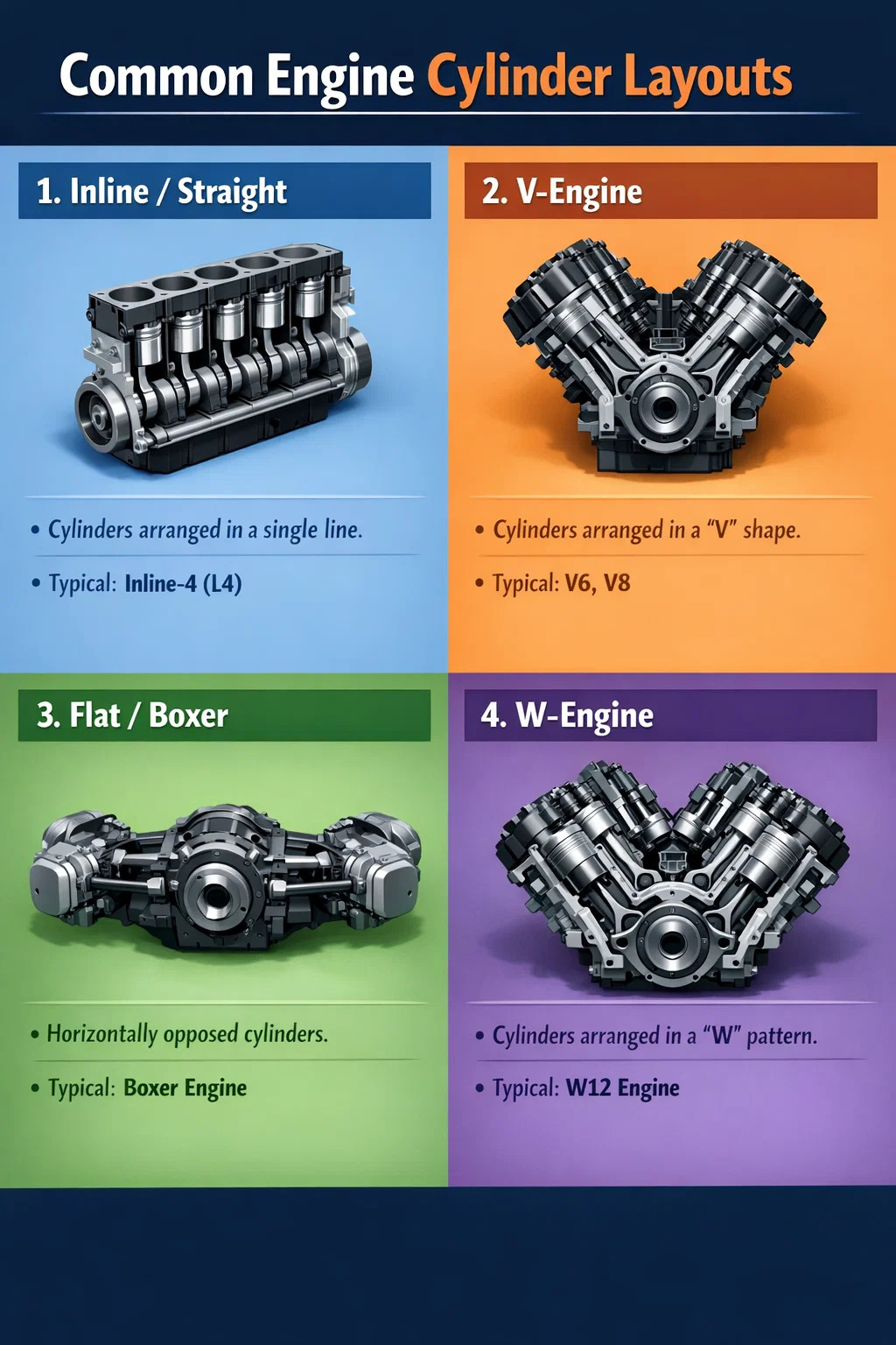 Toepassingen: Vaak aangetroffen in middelgrote tot grote sedans of krachtige sportwagens (zoals V6, V8). Op motorgebied is de V-twin een klassieker, bekend om zijn unieke ritme en sterke koppel bij lage toerentallen.