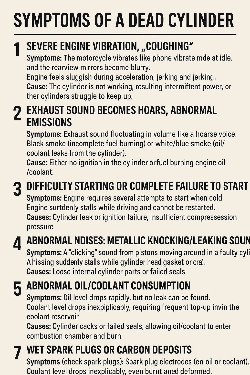 Wanneer een motorfiets cilinders volledig mislukt (algemeen bekend als een "dode cilinder"), zullen de volgende voor de hand liggende symptomen verschijnen: