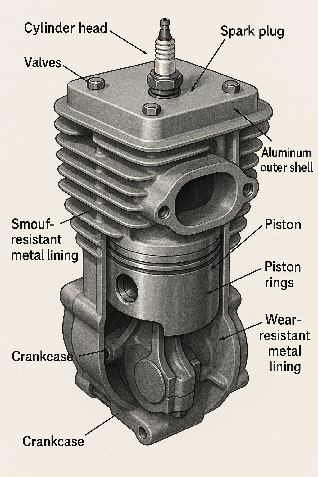 Heeft gewoonlijk een aluminium buitenschaal (lichtgewicht, snelle warmteafvoer), met een slijtvaste metalen voering aan de binnenkant (zoals een nikkel-siliciumcoating of ijzeren voering) om slijtage van de zuiger te voorkomen.